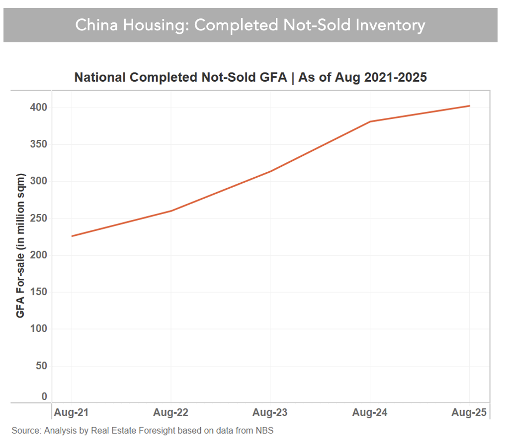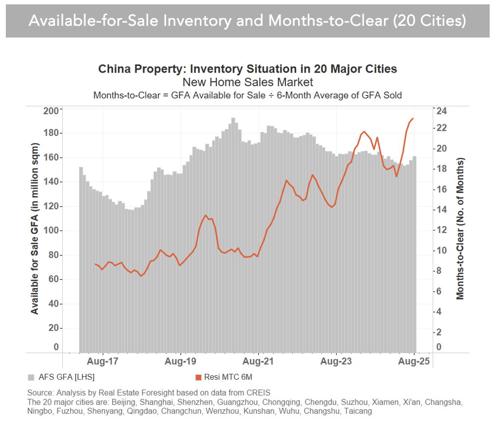 Now, however, a larger portion comes from unsold completed units. For example, in Guangzhou, according to CRIC, 51.3% of the available-for-sale inventory was completed and not sold, and 48.7% was under construction with permits to sell (June 2025).
