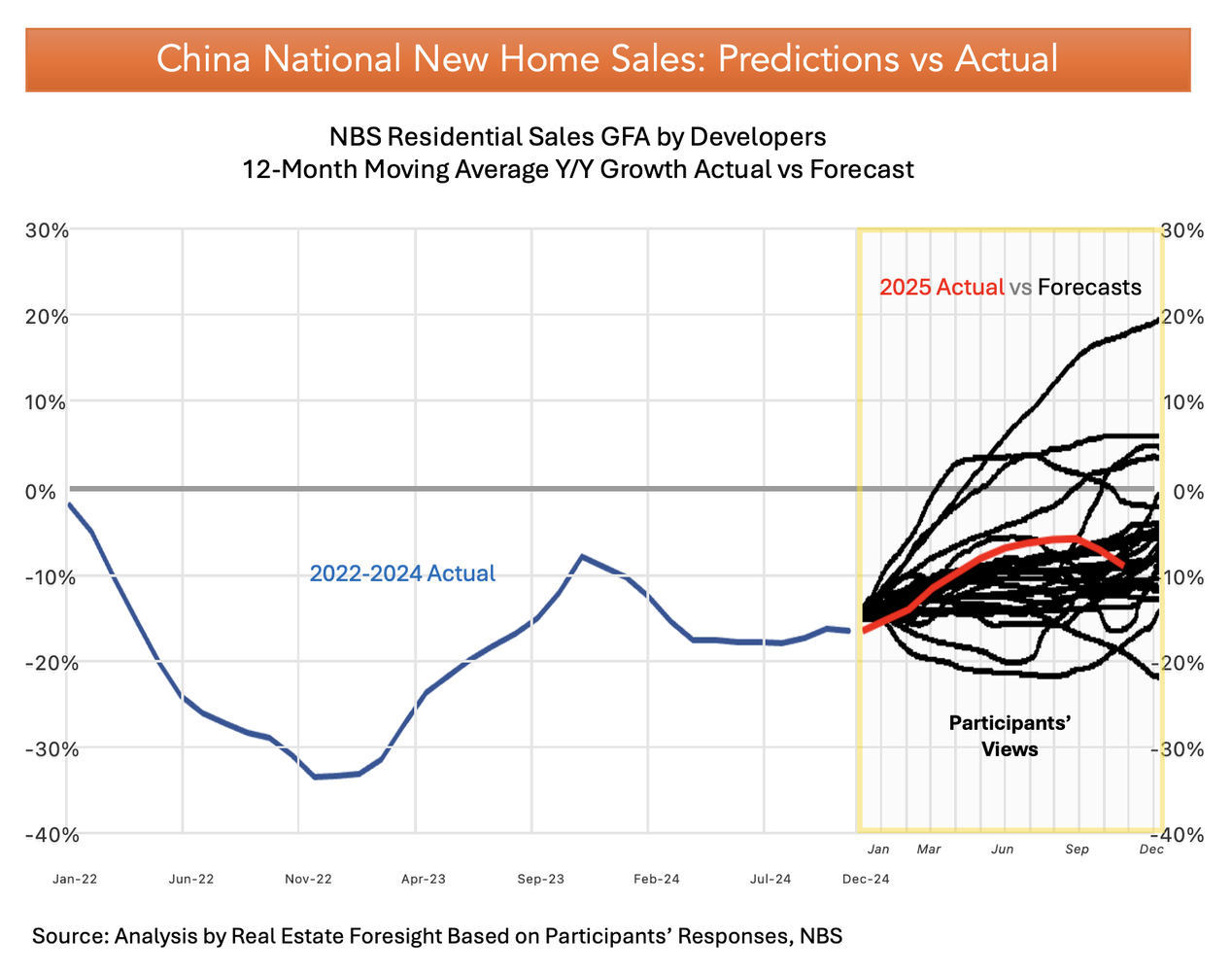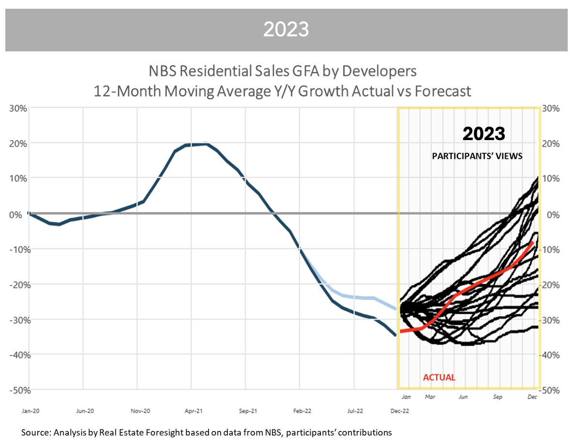 At Real Estate Foresight's annual China Property Outlook events, we ask the participants (a small sample of senior market players, well vested in the realities of the China property markets) to anonymously "draw the line" that would represent their best guess as to what will happen over the next 12 months to a very specific metric: the NBS national new home ('commercial residential') sales in GFA terms, on the 12-month rolling average year-on-year basis (12 months vs the prior 12 months).
