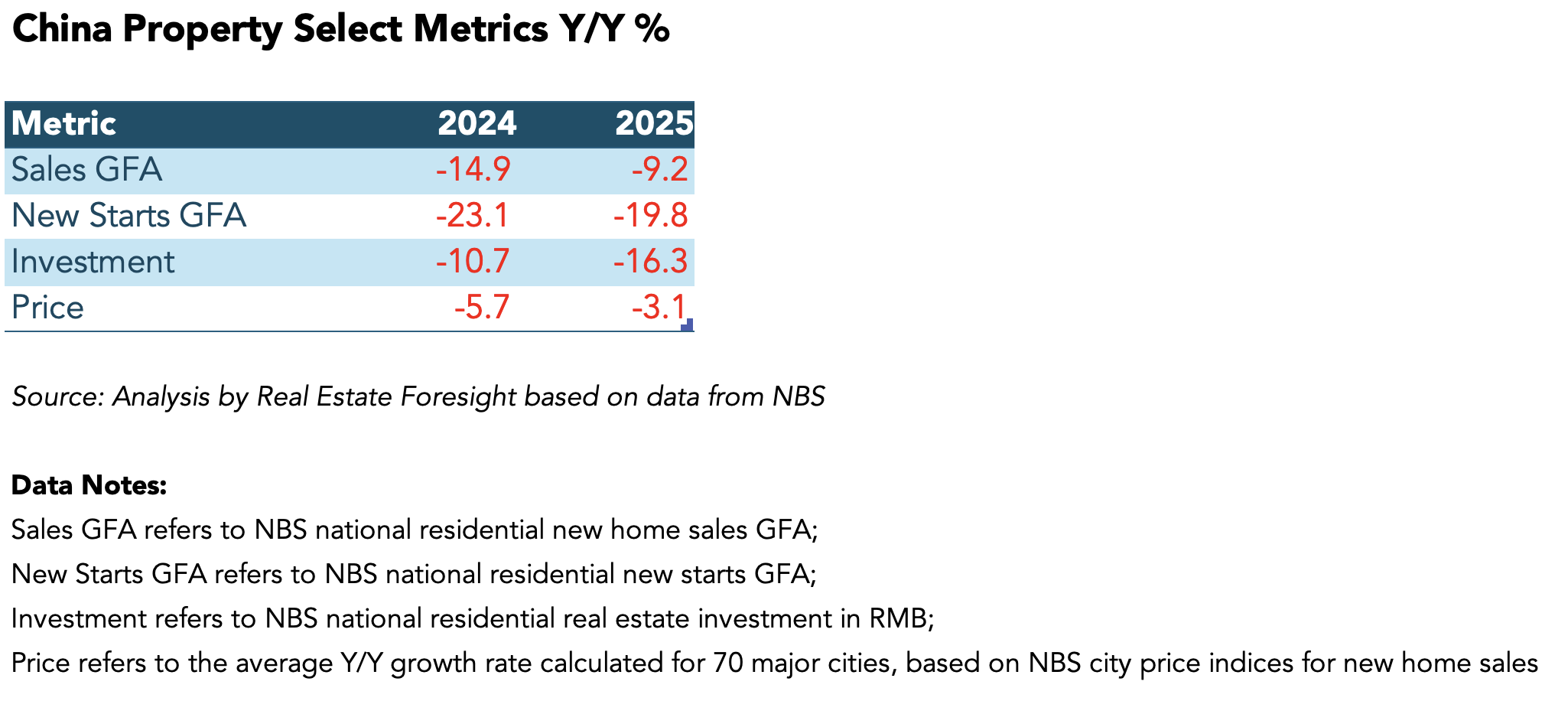 And "less negative" is still a decline. In absolute terms, 2025 was at the levels last seen in 2007 for GFA Sales, 2003 for New Starts, 2018 for Price Index (calculated average), and 2014-2015 for Residential Real Estate Investment.
