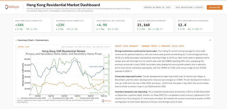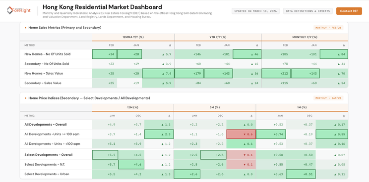 At Real Estate Foresight Limited (REF), we have introduced a Hong Kong Residential Dashboard, tracking the latest market changes through a comprehensive set of metrics and charts, available to clients as an extension of REF coverage from mainland China to Hong Kong SAR. For the pilot access via direct link - please contact us / DM.