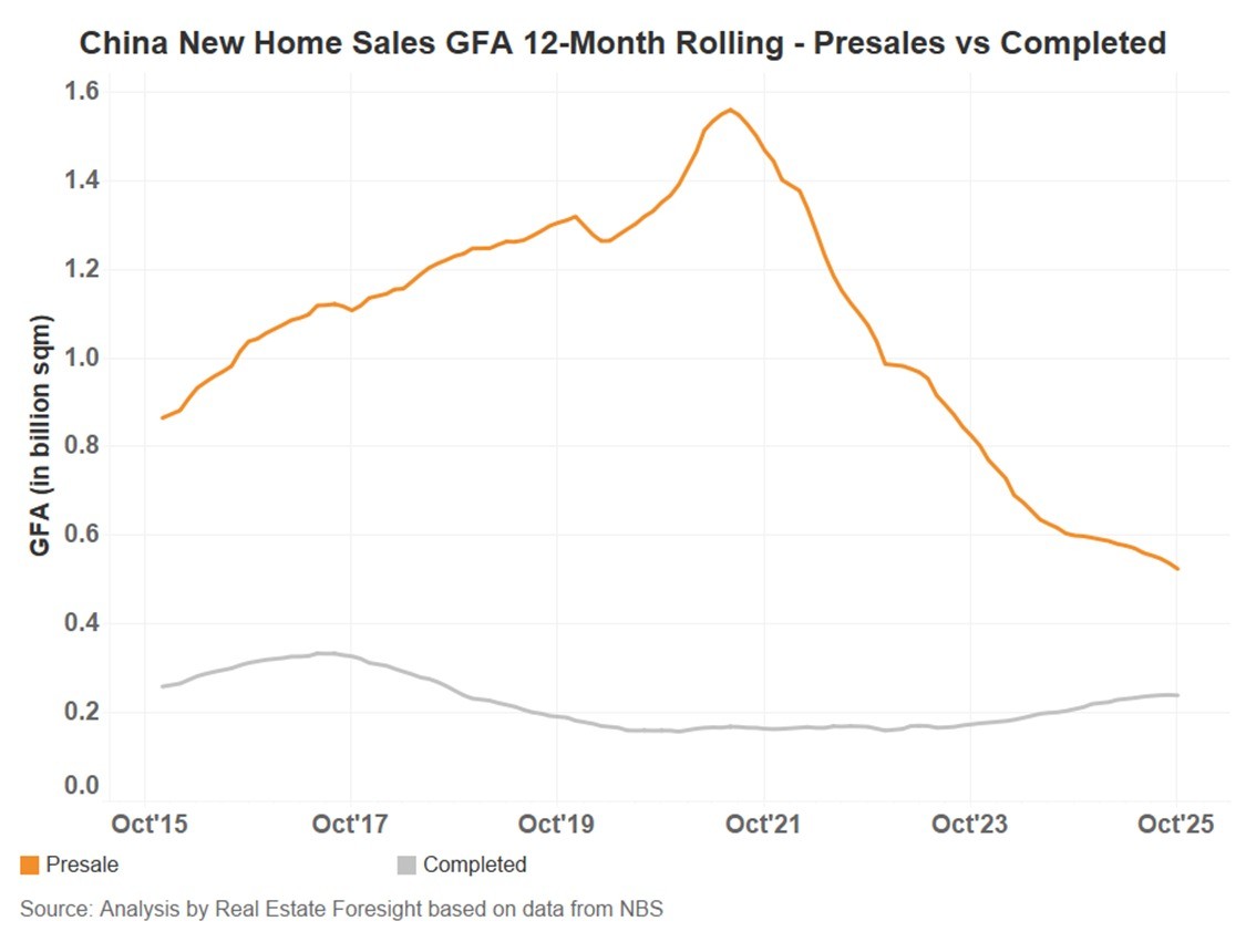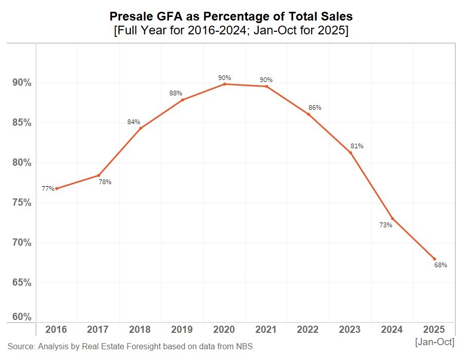 Pre-sales as a percentage of total new home sales reached 90% in 2020-2021, but have come down now to 68% for the Jan-Oct 2025 period (here in terms of sqm GFA):