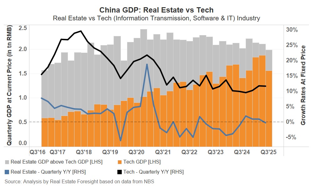 The chart below overlays the quarterly GDP figures (in absolute terms and year-on-year growth) for 'Real Estate' and 'Information Transmission, Software & IT' (as a proxy for 'Tech') industries. Based on the latest Q3 2025 data released on October 20, 2025.